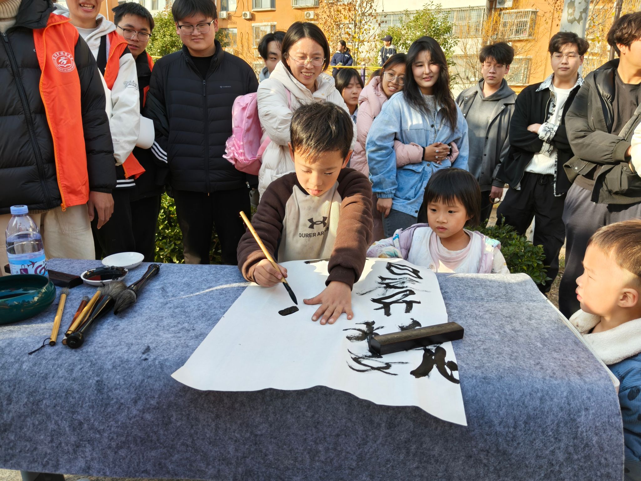 活动现场暖意融融,志愿者们提前备好宣纸、毛笔、墨汁等书法工具,在小区活动区域热情邀请小朋友参与体验。书法学专业的志愿者们手把手引导孩子们握起毛笔,从横、竖、撇、捺等基础笔画教起,耐心纠正握笔姿势与运笔手法;孩子们好奇又专注,一笔一划临摹一些简单汉字,稚嫩的笔触里藏着认真,墨香萦绕的现场满是童真童趣。志愿者们还结合汉字含义,用通俗的语言讲解书法背后的文化小故事,让小朋友们在书写中感知传统文化的魅力。