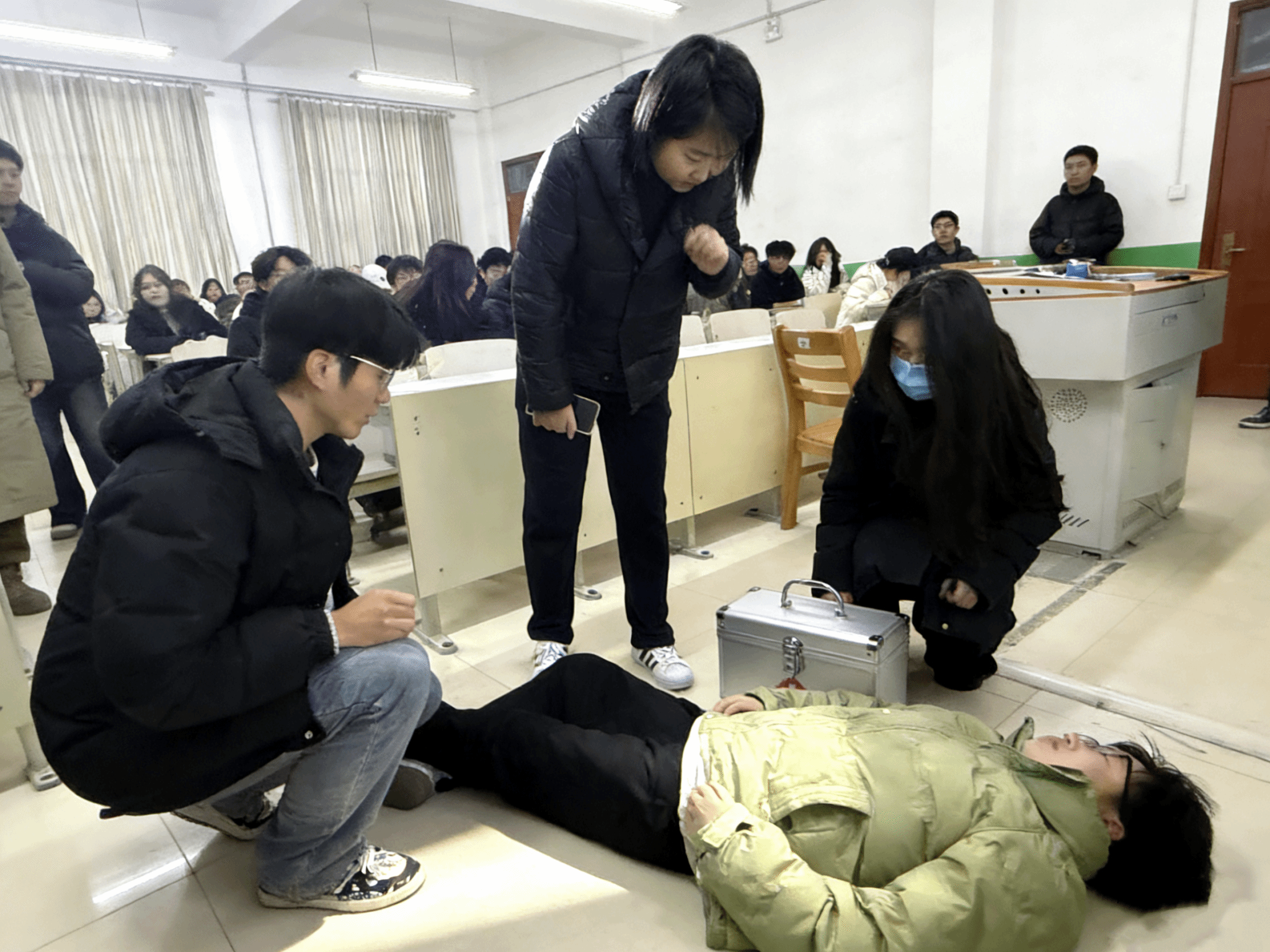 本次演练亮点显著、贴合实战,严格按预设流程有序推进。上课期间,模拟学生突发面色苍白、头晕乏力后晕倒,授课教师第一时间终止教学,迅速疏散围观学生、划定安全区域,同时遵循“不随意搬动”原则,轻唤学生并查看呼吸与颈动脉,完成初步生命体征判断。随后指挥班长在教室门口设警戒、疏散围观人员,团支书同步拨打校医、120急救及辅导员王静电话,清晰报备事发地点与学生状态。辅导员王静到达后及时安抚学生情绪并上报学院,医护人员抵达后开展意识呼唤、脉搏检测等专业处置,急救车到后,辅导员携带学生信息与病史记录对接医护人员。安保人员全程疏导楼道人流,多方联动高效衔接。学生送医后,教师返回教室恢复课堂秩序。全流程衔接顺畅、操作规范,积累了宝贵应急处置经验。