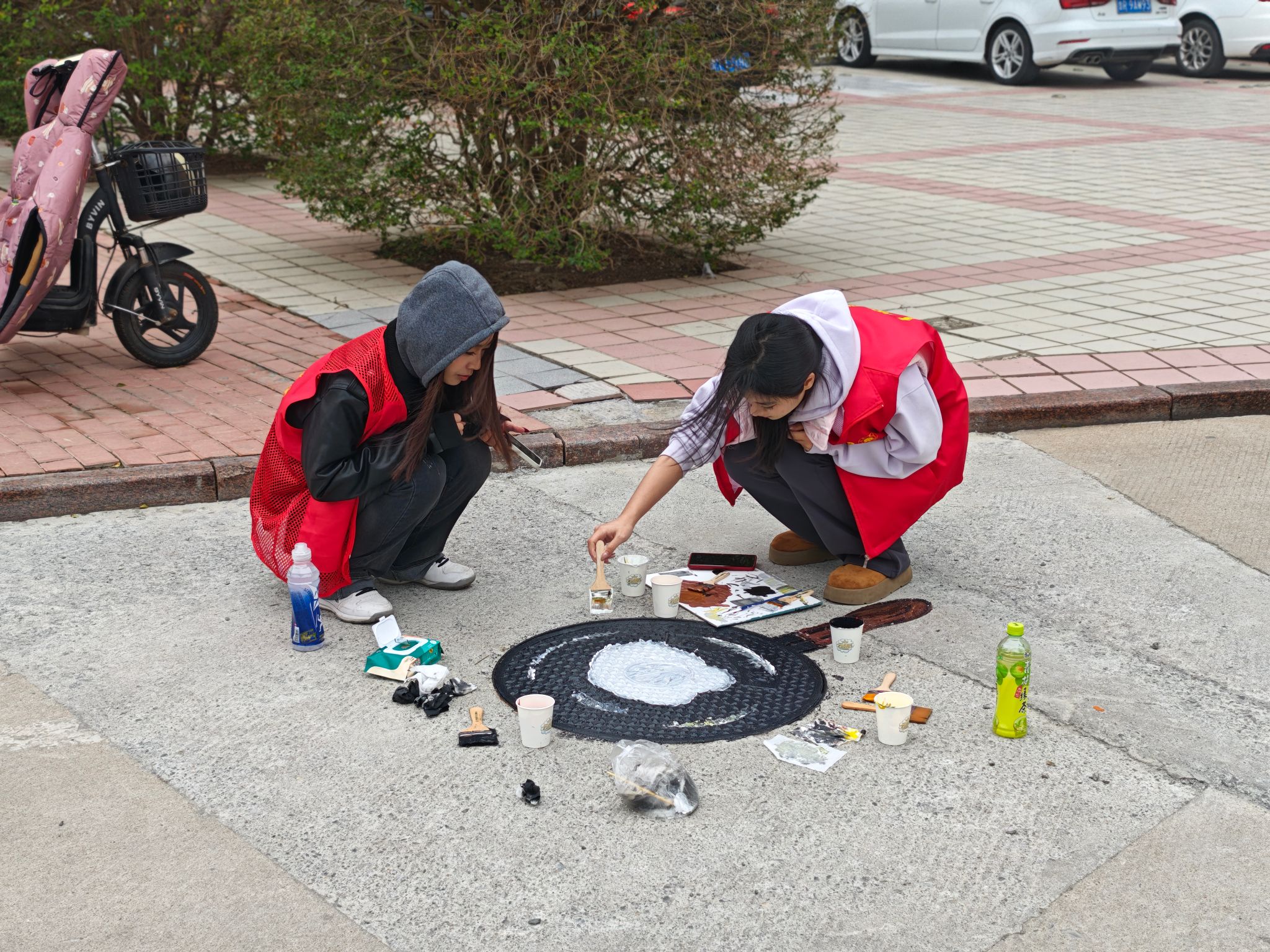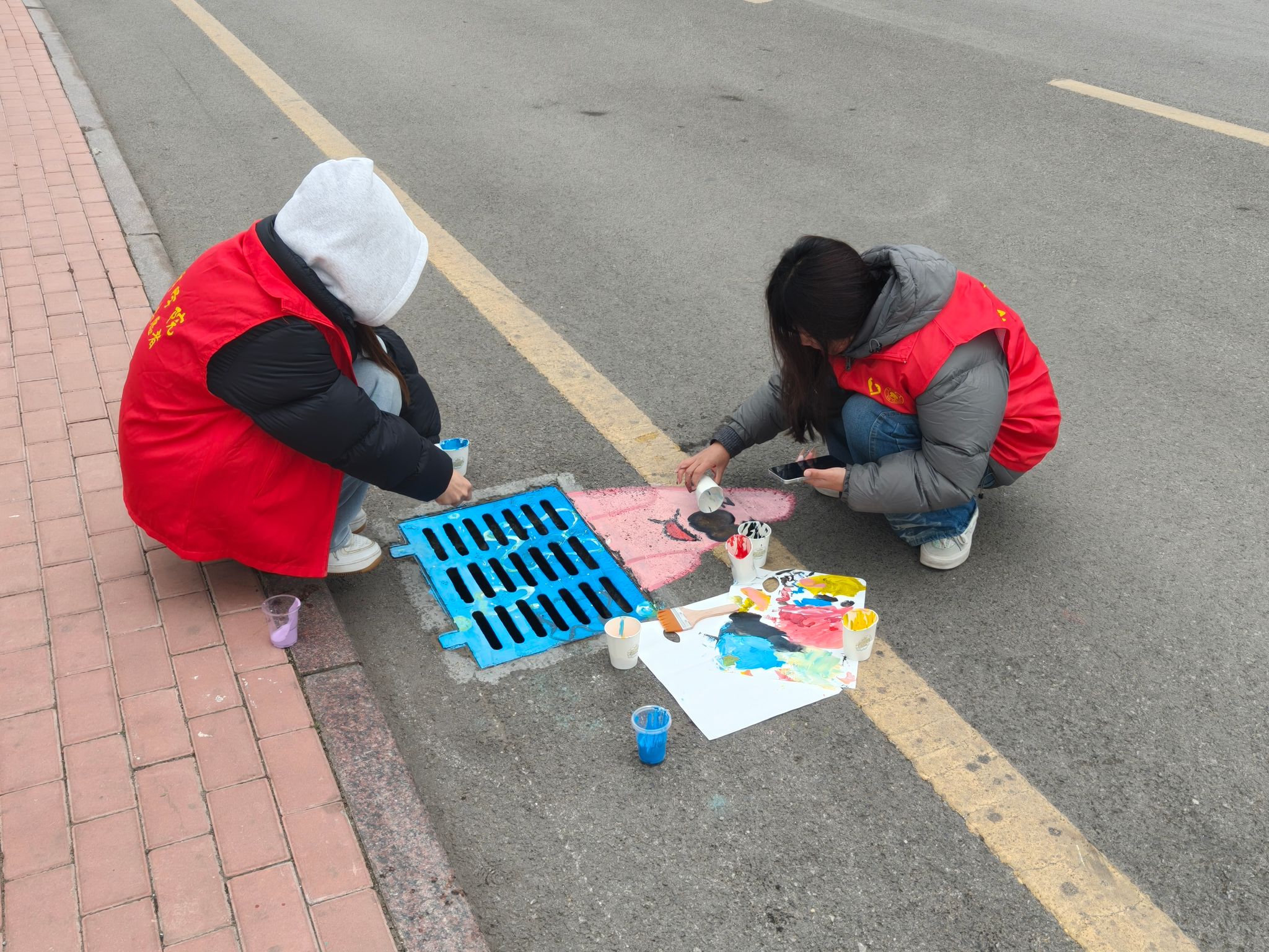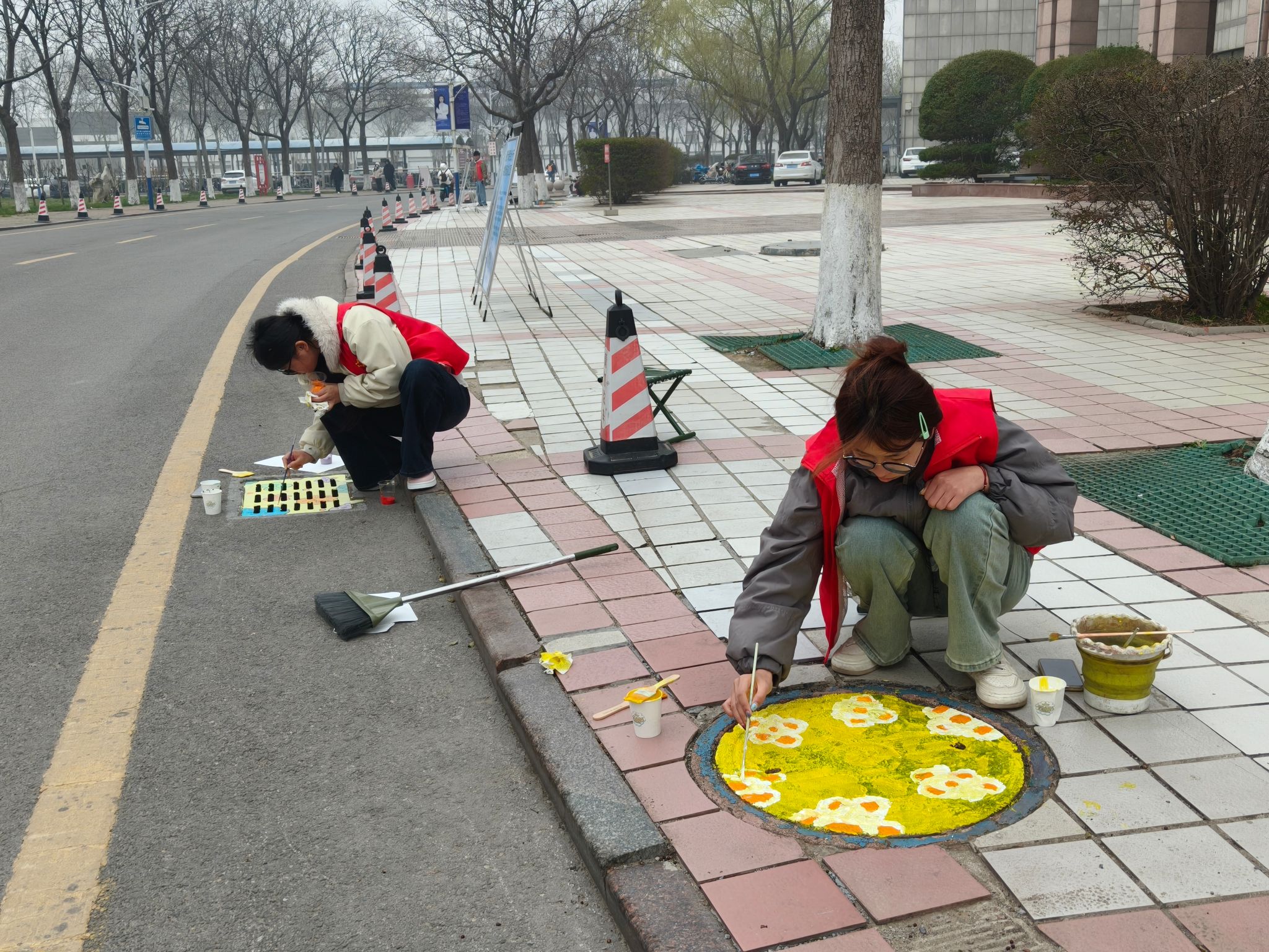 活动现场,志愿者们热情高涨,分工明确,在充分了解校园场地情况后,迅速制定方案,展开创作。他们将丰富的创意与对校园的热爱融入创作,用画笔在井盖上精心绘制出一幅幅充满想象力与感染力的作品。栩栩如生的动物形象、充满童趣的卡通角色、富有文化底蕴的传统纹样,每一幅地绘作品都凝聚着志愿者们的心血与创意。创作过程中,大家互帮互助、共克难题,以行动践行雷锋精神,让青春在服务中绽放绚丽之花。