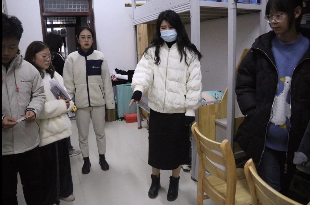 在检查过程中,何老师详细查看学生宿舍消毒用品、体温计等防护物资配备情况,了解学生思想动态。天气转凉,老师提醒同学们添衣御寒,以饱满的状态投入学习生活中去。何老师也仔细查看了同学们的课本书籍,并就其中的内容与同学们进行亲切的讨论交流,并鼓舞同学们积极思考,做好大学期间的规划。老师的谆谆教诲,让同学们感受到了亲切的关心和温暖。此次检查对20级女生宿舍进行了一次摸底、排查,既发现了问题,也增进了师生情谊。