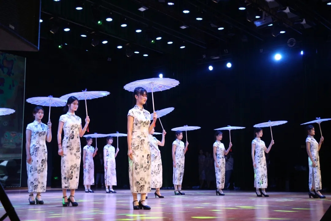 比赛中,美术与设计学院的女大学生身着一袭素雅的旗袍登上舞台。整齐划一的动作、精心编排的走位,尽显女大学生的端庄与自信之美。各院的旗袍队伍陆续上台,新时代女性积极向上的精神风貌与魅力被展现的淋漓尽致。