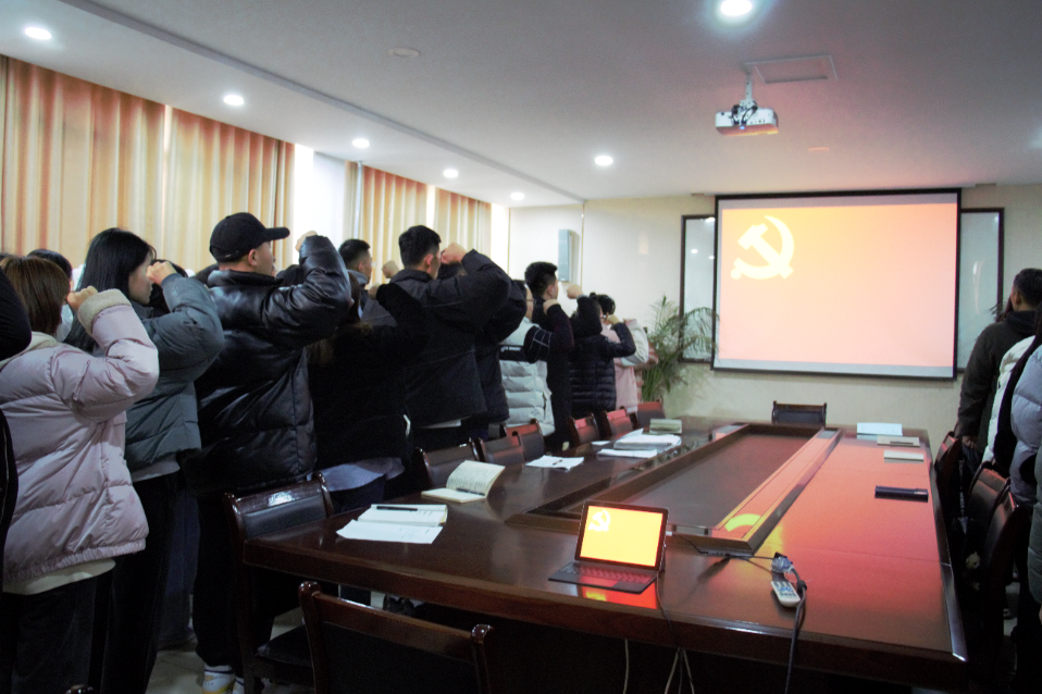 大会开始,全体与会人员起立,奏唱《国际歌》。学生党支部书记杜红梅发表致辞。随后,宣誓仪式开始,全体党员起立面向鲜艳的党旗,由党员代表曲爱洁带领全体党员举起右手,在党旗下宣誓,庄严神圣的入党誓词在会议室中回荡。宣誓结束后,由预备党员代表田亚鑫、赵冉发言。