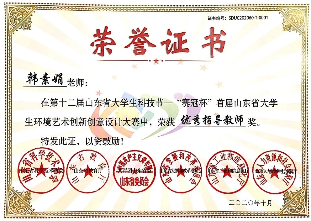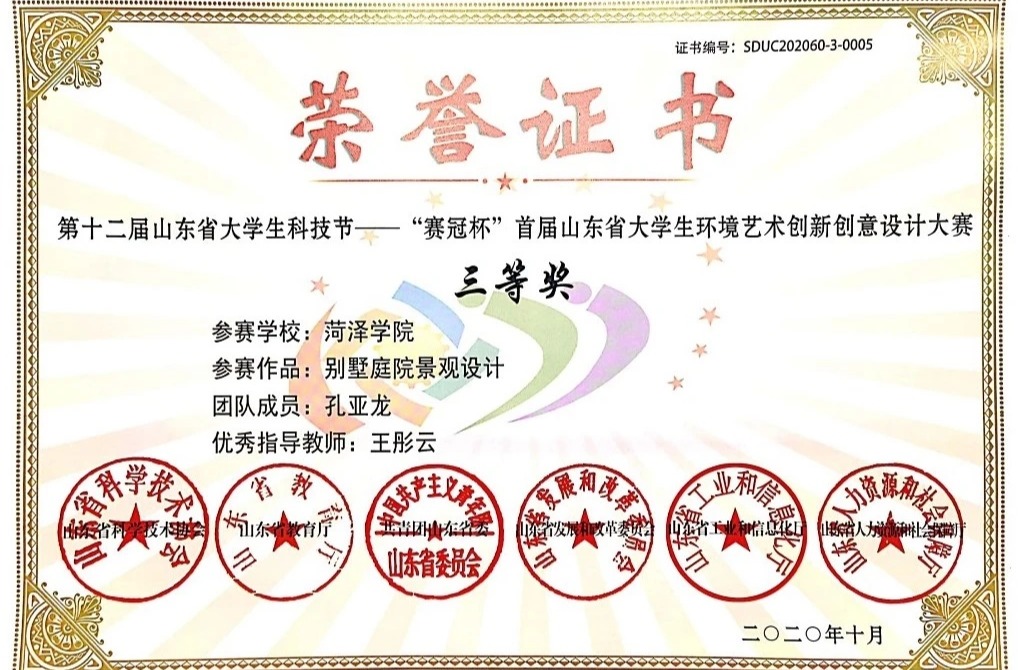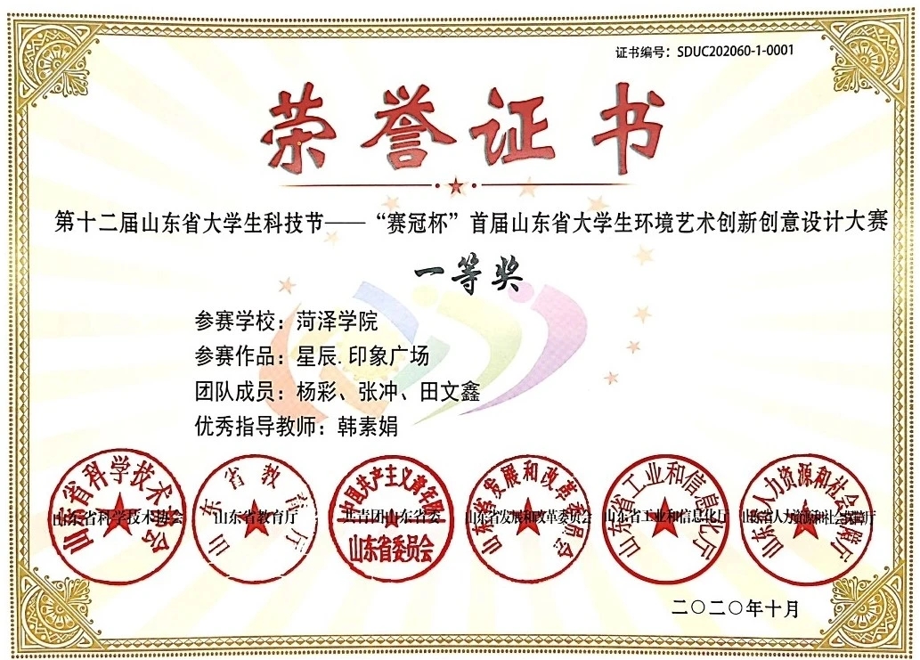 近日,由山东省科学技术协会、山东省教育厅、共青团山东省委、山东省发展和改革委员会、山东省工业和信息化厅、山东省人力资源和社会保障厅联合主办山东省大学生环境艺术创新设计大赛评选结果揭晓。菏泽学院美术与设计学院环境设计专业学生杨彩、张冲 、田文鑫以组为单位作品《星辰.印象广场》获得一等奖;孔亚龙创作的作品《别墅庭院景观设计》获得三等奖。韩素娟,王彤云获得优秀指导教师奖。