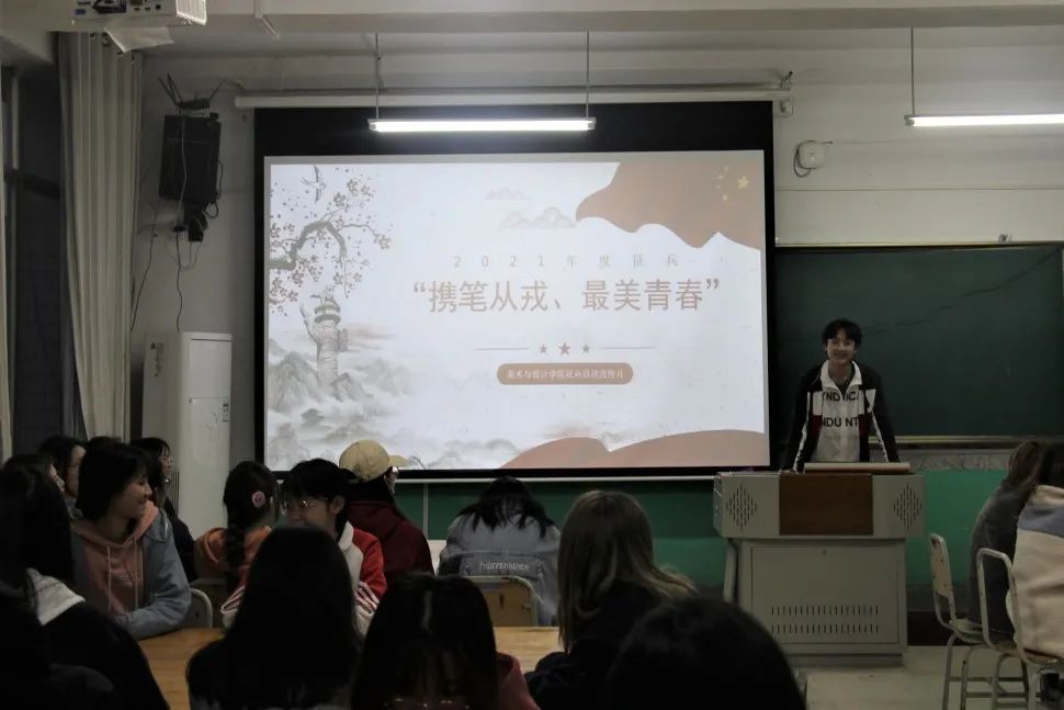 为加强和改进征兵宣传工作的方式方法,增强征兵宣传工作的针对性和有效性,2021年4月22日晚7点,美术与设计学院向全体20级在校学生开展“携笔从戎、最美青春”征兵宣传活动。