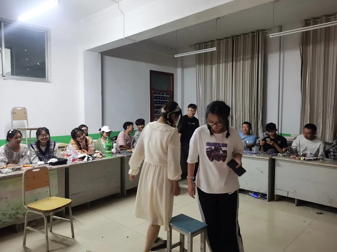 晚会上,美术与设计学院各个专业的同学们在教室欢聚一堂,虽然大家来自五湖四海,但经过军训的洗礼同学们早就亲如一家。