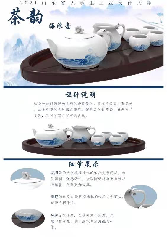 美术与设计学院刘广鹏、阚立妹同学作品《海洋主题茶具设计》获陶瓷产品设计类三等奖;王学垚同学作品《'一种重量‘泡面盒》获可持续发展设计类三等奖;曹祥争、李晓玉同学作品《海洋科普相机》获科普产品设计类三等奖。刘颖、刘莹、张东方老师被评为优秀指导教师。