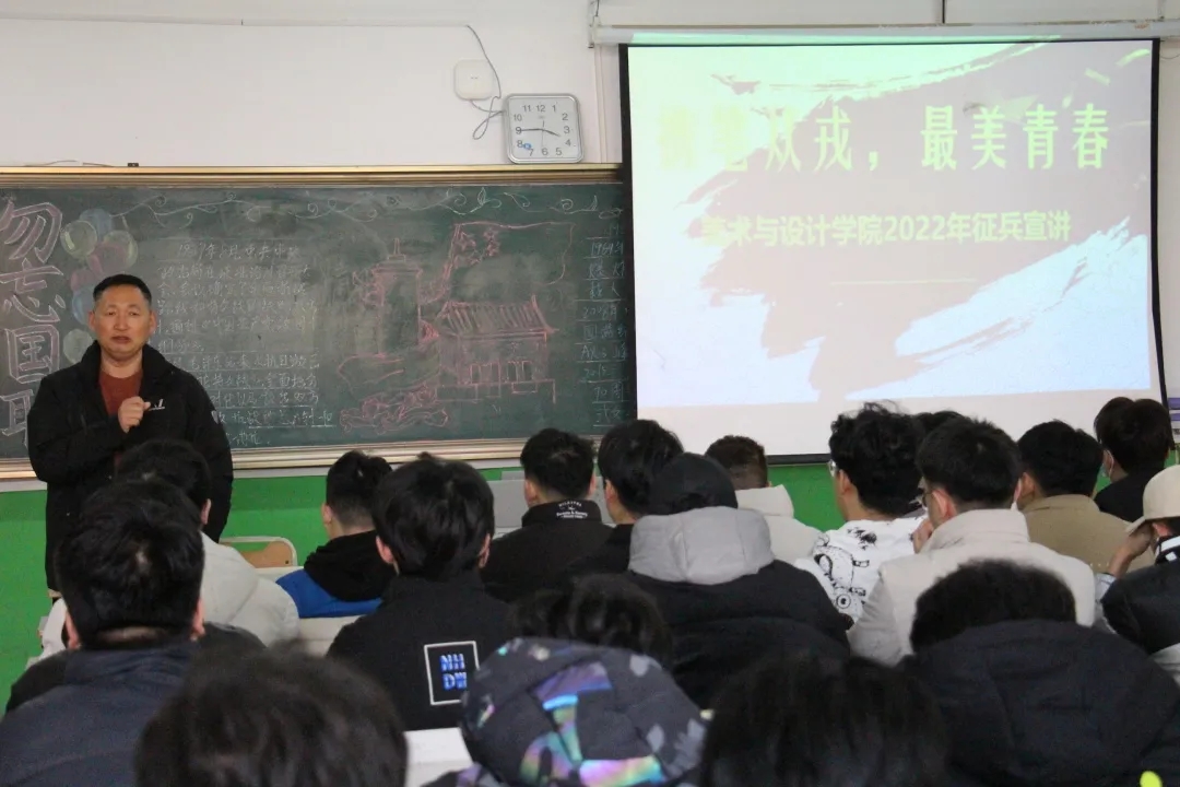 为响应祖国号召积极动员大学生携笔从戎,报效国家。12月14日上午十点,美术与设计学院于203教室召开了美术与设计学院2022年征兵动员大会。本次动员大会由美术与设计学院19级辅导员郭江老师主持,19级全员男生参加会议。