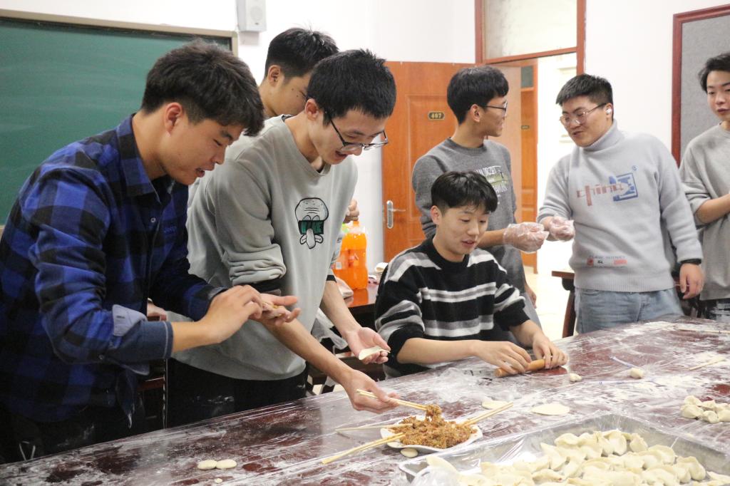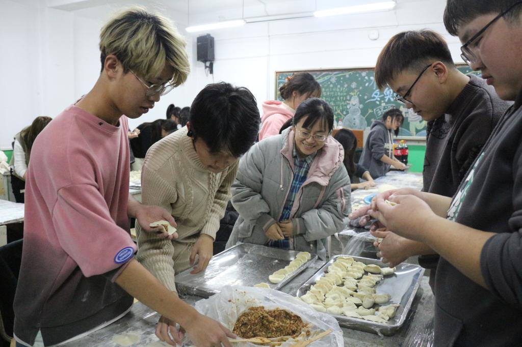 在包饺子的过程中,大家分工协作,你擀皮,我包馅,脸上写满了快乐和幸福。师生都用自己家乡的方式包着各种造型和风格的特色饺子,现场欢声笑语,温暖四溢,其乐融融,到处洋溢着“家”的味道。在等待饺子出锅的时间里,平时忙忙碌碌的班主任老师在这一刻闲了下来,与同学们讨论学习上的问题闲聊着生活的琐事,享受着难得的悠闲冬日。