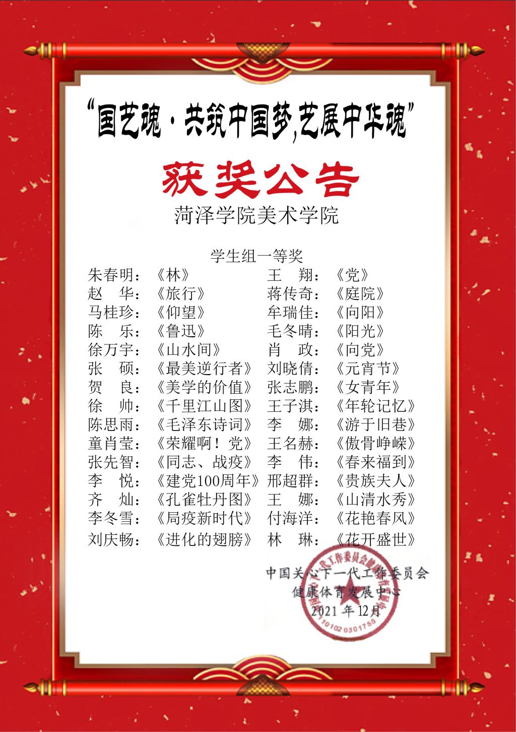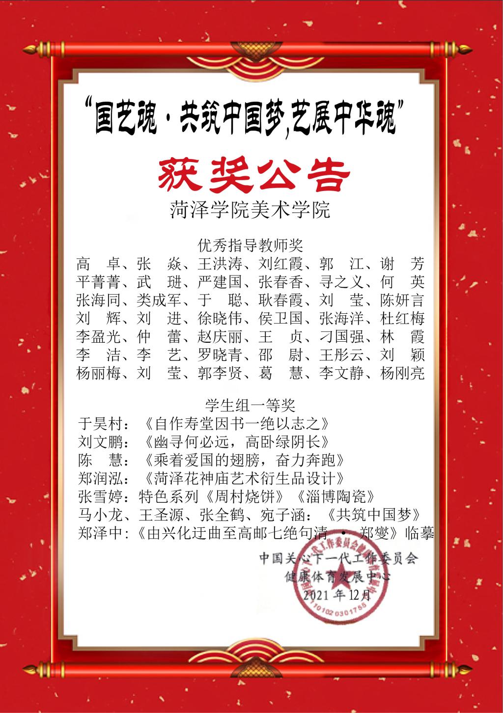 “国艺魂·共筑中国梦,艺展中华魂”。2021年12月,菏泽学院美术与设计学院迎来了国培计划的捷报。在捷报中,107位同学获得学生组一等奖;62位同学获得学生组二等奖;34位同学获得学生组三等奖。
