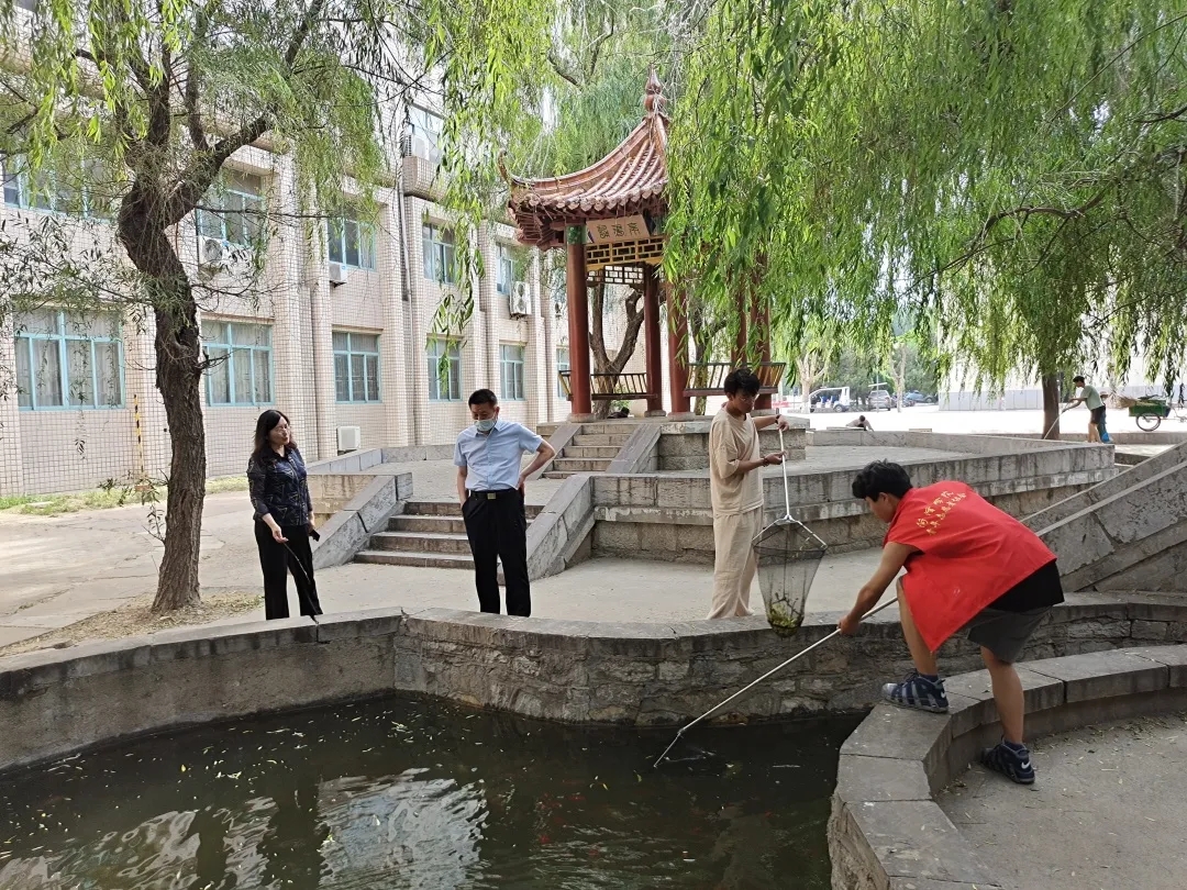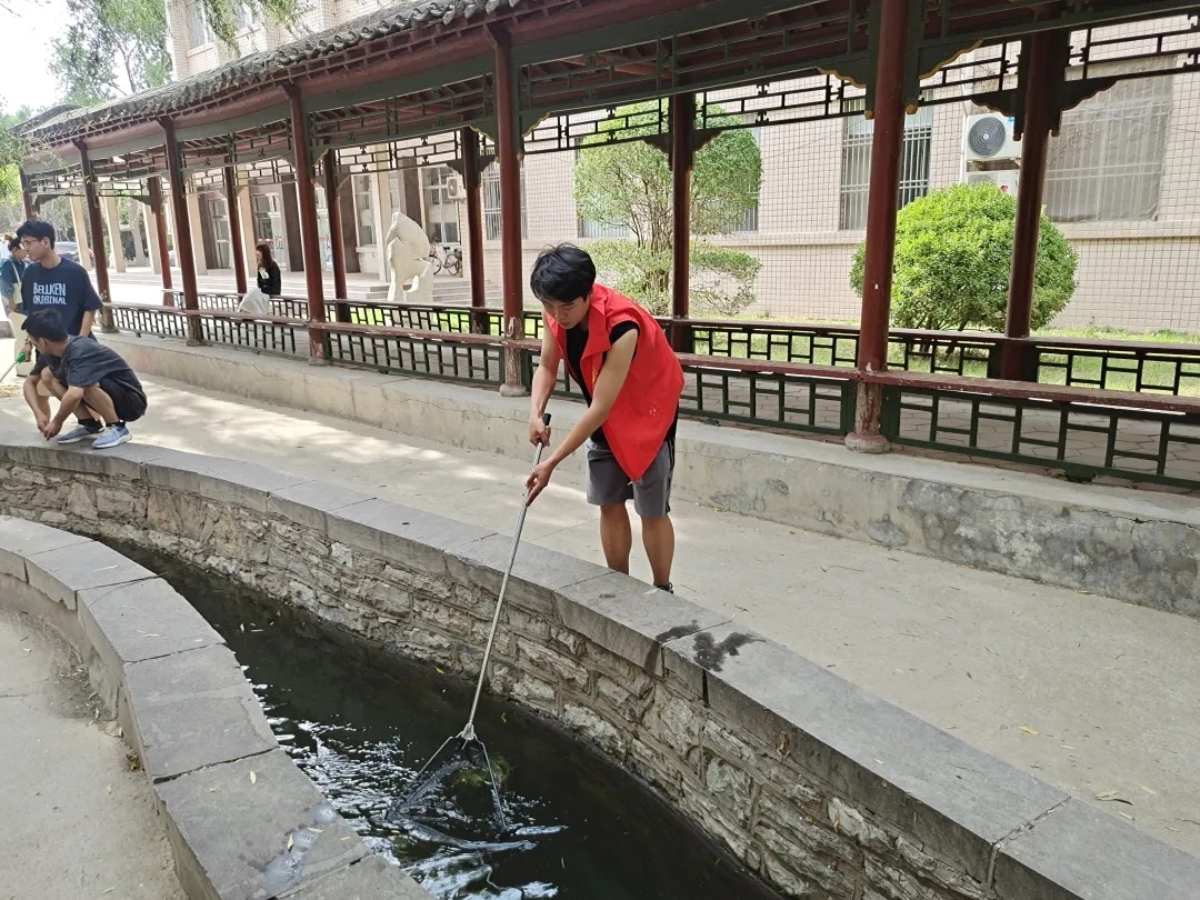 志愿者们顶着烈日骄阳,对池塘中的落叶、杂物、垃圾等进行了彻底清理,对周边环境卫生进行了全方位的大扫除。看到池塘里一条条活泼美丽的鱼儿,志愿者们热情高涨。不怕脏、不怕累,干劲十足。看到通过自己辛勤劳动换来的整洁、美丽的校园环境,青年志愿者们累并快乐着。