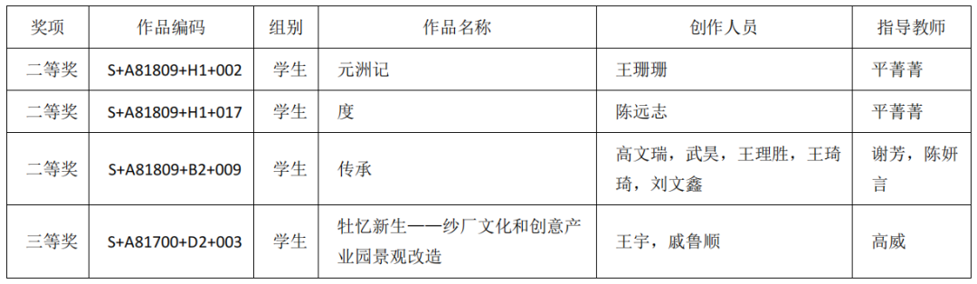 第十届未来设计师·全国高校数字艺术设计大赛(NCDA)全国总决赛获奖名单近日已出炉。美术与设计学院动画专业的王珊珊的插画作品《元洲记》、陈远志的插画作品《度》、高文瑞、武昊等的动画作品《传承》均荣获学生类二等奖。环境设计专业王宇、戚鲁顺的《牡忆新生—纱厂文化和创意产业园景观改造》荣获学生类三等奖。