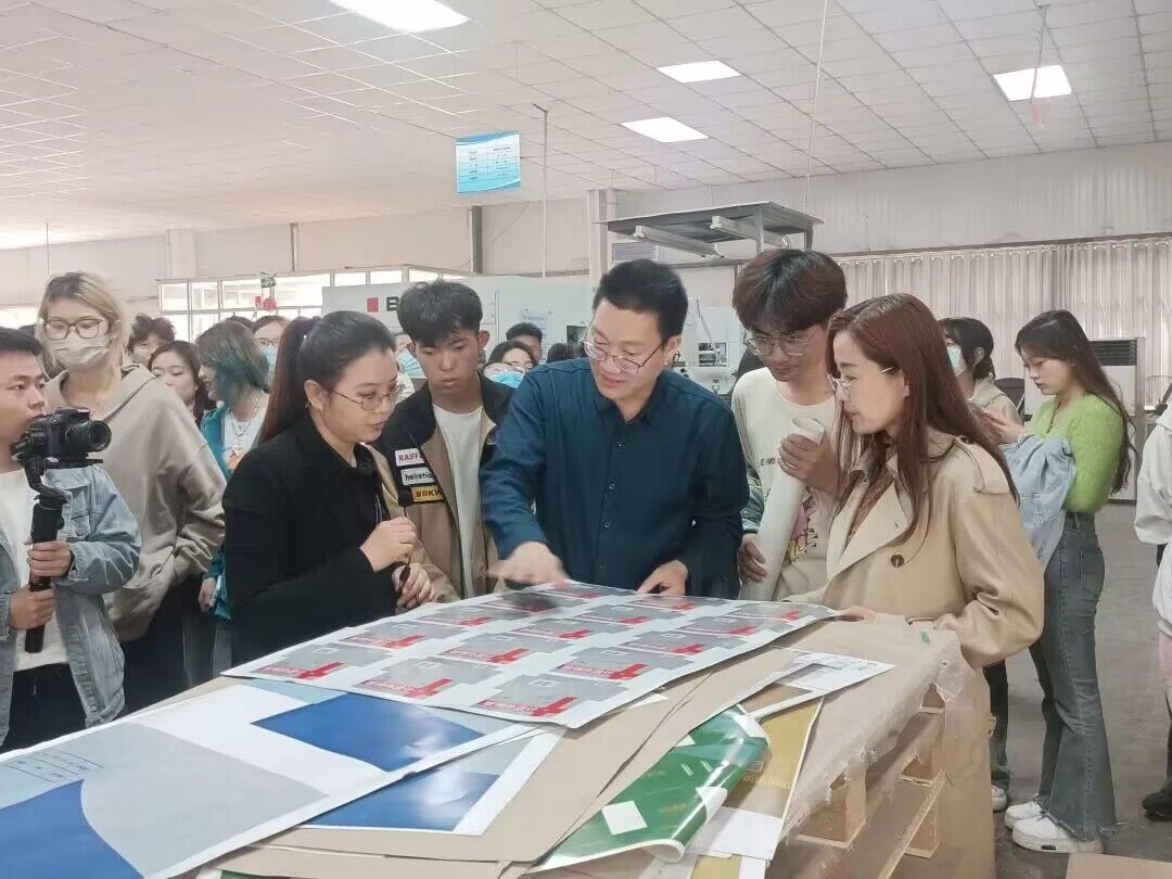 为了让视觉传达设计专业的同学更好的学习理解印刷工艺相关的知识,充分利用“第三课堂”资源打破空间限制,4月28日下午,美术与设计学院开展学生实践考察活动,由美术与设计学院视觉传达系主任刘进、专业老师林霞带领21级视觉传达专业学生赴菏泽环宇包装印刷有限公司进行学习考察。
