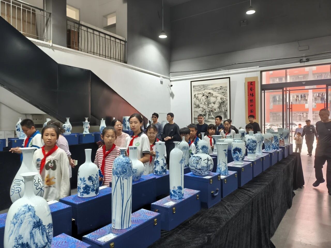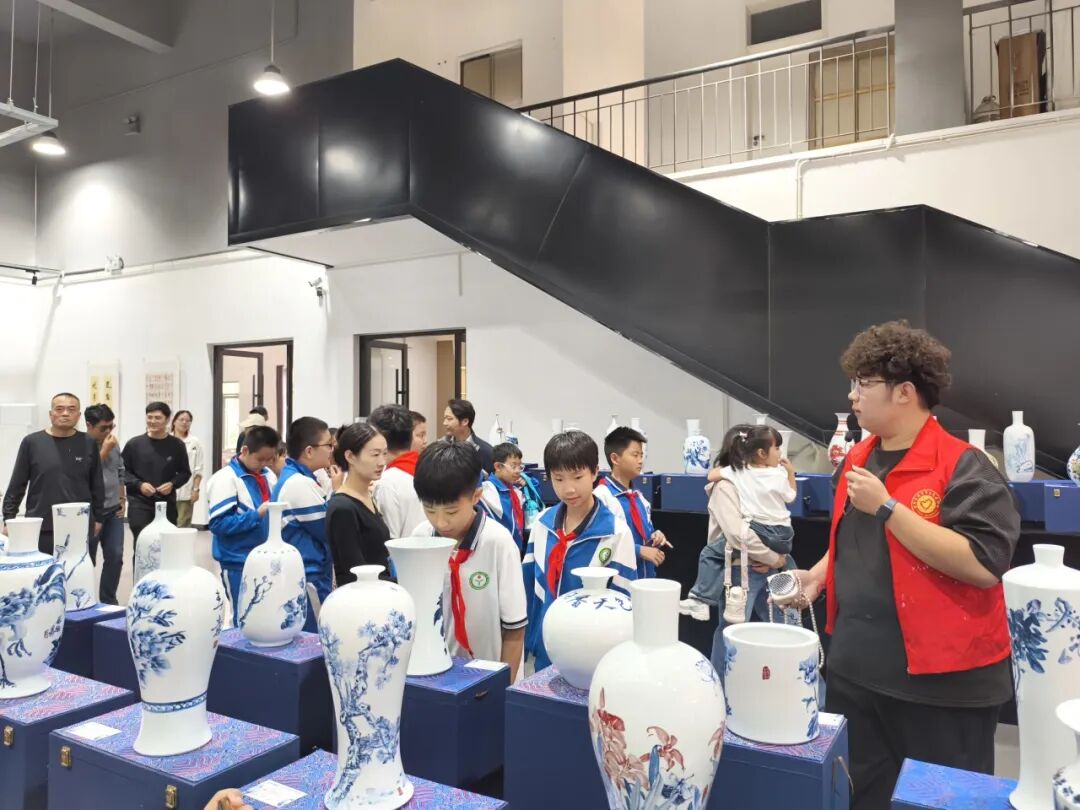 本次展览集中展示了我院教师瓷上绘画作品。在志愿者的专业引导下,学生和家长们有序开展参观活动:观展过程中,大家一方面驻足瓷器前,仔细品鉴青花缠枝莲纹瓷瓶的流畅线条;另一方面围聚于志愿者身旁,认真聆听关于瓷上绘画勾勒技法与青花料调制工艺的详细讲解,沉浸式感受瓷上绘画艺术的深厚魅力。此次展出的瓷上。绘画作品造型各异、笔触精湛,充分体现了创作者的匠心巧思,令人印象深刻。