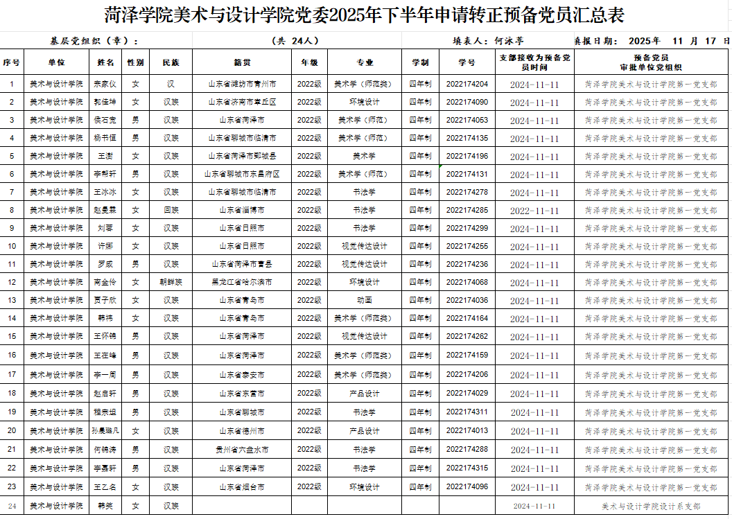 经党组织培养考察,征求党员、群众和培养联系人意见,支委会审查,同意 侯石宽、赵启轩 等 24 名预备党员同志按期转正,其中包含23名学生预备党员,1名教师预备党员。现将预备党员转正名单公示如下(名单附后):