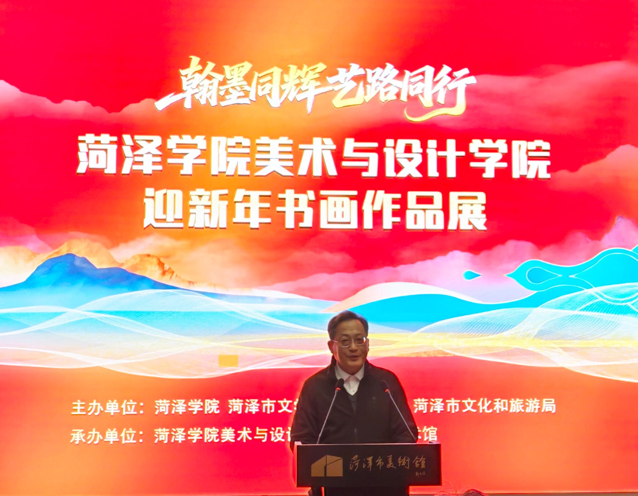 1月7日,菏泽学院美术与设计学院“翰墨同辉 艺路同行”迎新年书画作品展在菏泽市美术馆拉开帷幕。菏泽学院党委委员、副校长田智祥,菏泽市文学艺术界联合会主席田继雷,菏泽市文化和旅游局二级调研员朱政,曹州书画院院长徐明军,菏泽学院相关部门负责人,市美协、书协负责人及艺术家代表,美术与设计学院师生代表等出席开幕式。开幕式由美术与设计学院院长高卓主持。