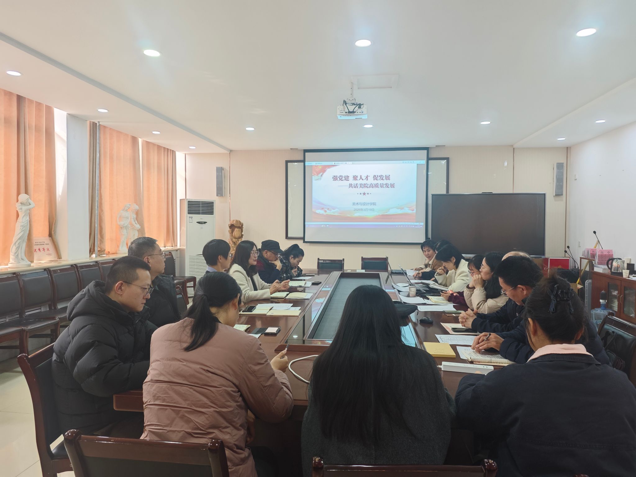 为深化树立和践行正确政绩观学习教育,全面落实《菏泽学院“人才建设年”实施方案》,强化党建引领、凝聚人才合力,推动2026年度各项工作落地落实,3月19日,美术与设计学院召开“强党建 聚人才 促发展——共话美院高质量发展”专题会议,学院领导班子、各党支部书记及全体博士参加会议。
