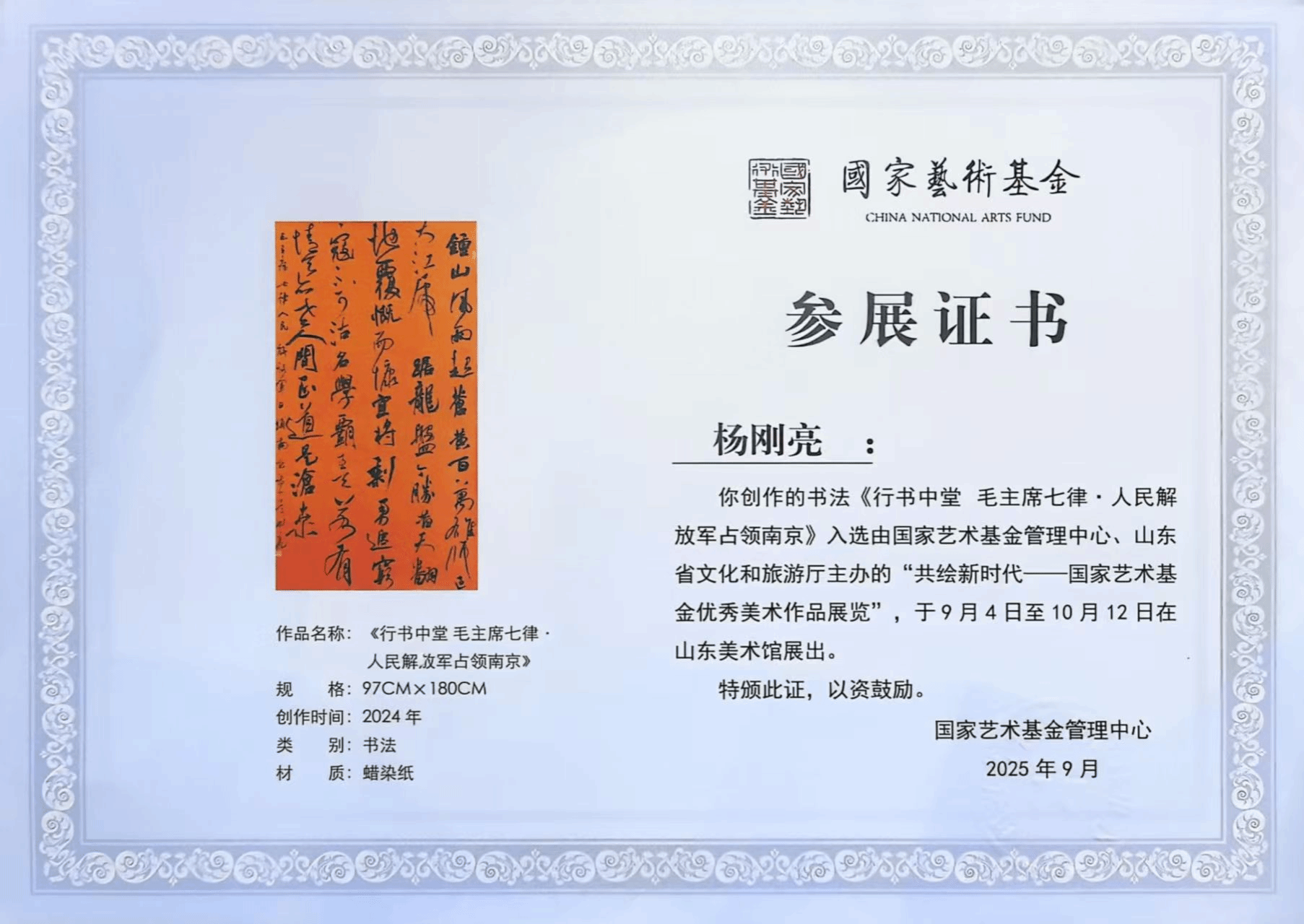 其中,美术与设计学院杨刚亮副教授创作的书法作品《行书中堂 毛主席七律・人民解放军占领南京》成功入选。其作品以 “诸体兼融” 为创作核心思维,秉持 “致中和” 的艺术追求,以二王、米芾书风为基调,融入颜真卿书法宽博疏阔之气与北朝碑刻方刚古朴之韵,力求呈现清刚雄浑、正大宏阔的气象。