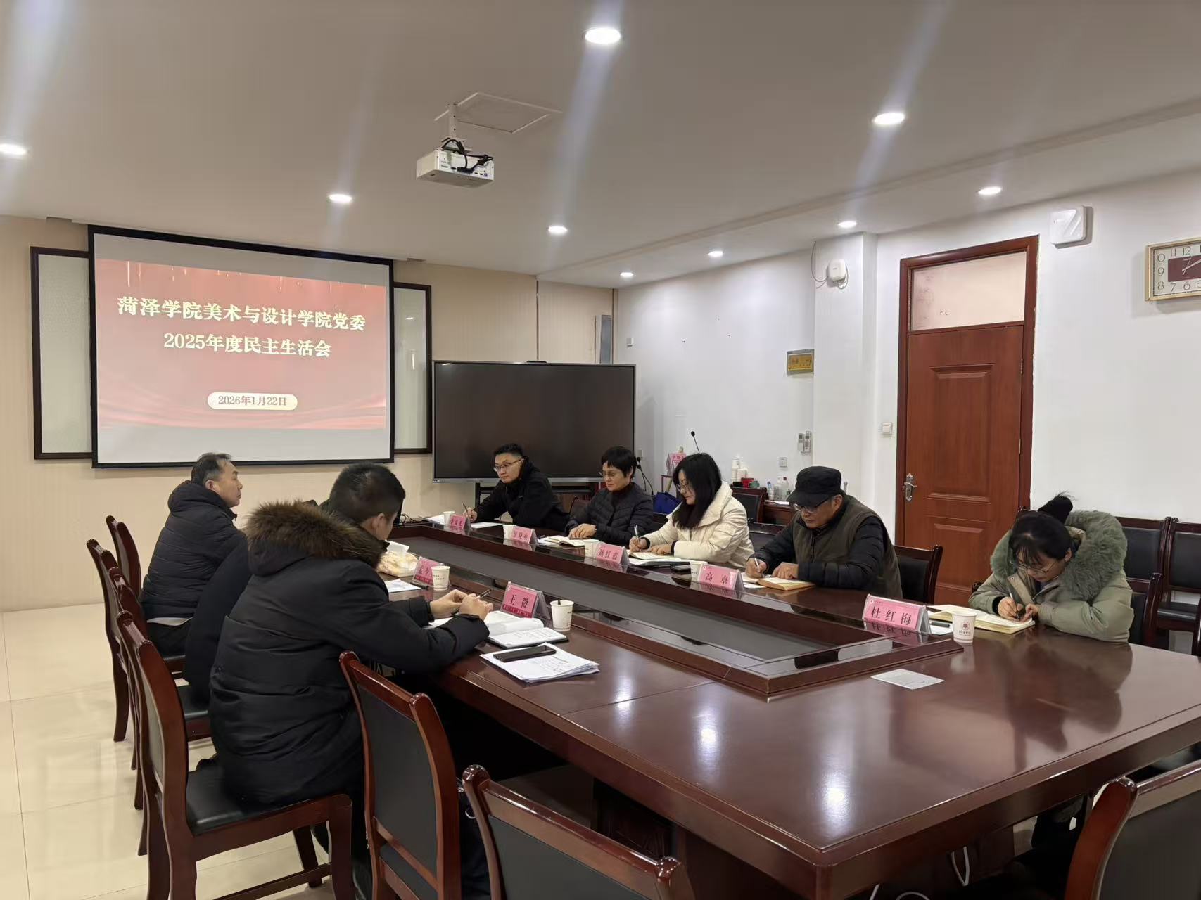 为深入学习贯彻习近平新时代中国特色社会主义思想,全面落实党的二十届四中全会精神,按照学校党委统一部署,菏泽学院美术与设计学院党委1月22日上午召开2025年度民主生活会。学校党委副书记孟令美,组织部党校办公室主任林建国,纪委纪检监察员王徵到会指导。学院党委书记刘红霞主持会议并作总结发言,学院党委班子成员参会,学工办、党政办主任列席会议。